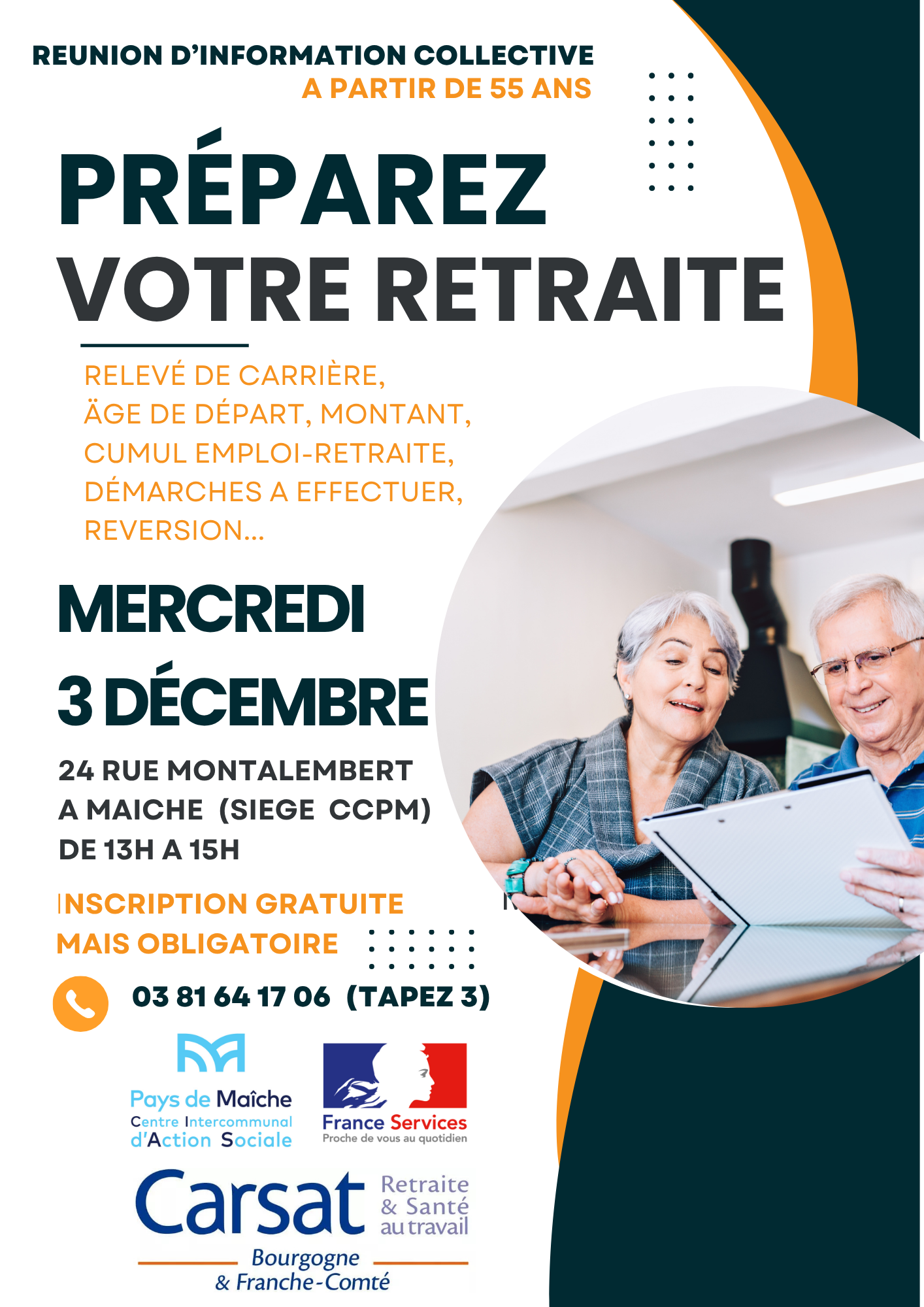 L’espace France Services de la CC Pays de Maiche, en partenariat avec la CARSAT Bourgogne-Franche-Comté, organise une réunion d’information collective. Date : Mercredi 3 décembre 2025 Heure : 13h00 pour une durée d’environ 2h00 Lieu : Salle de la Charbonnière – Locaux de la Communauté de Communes -...