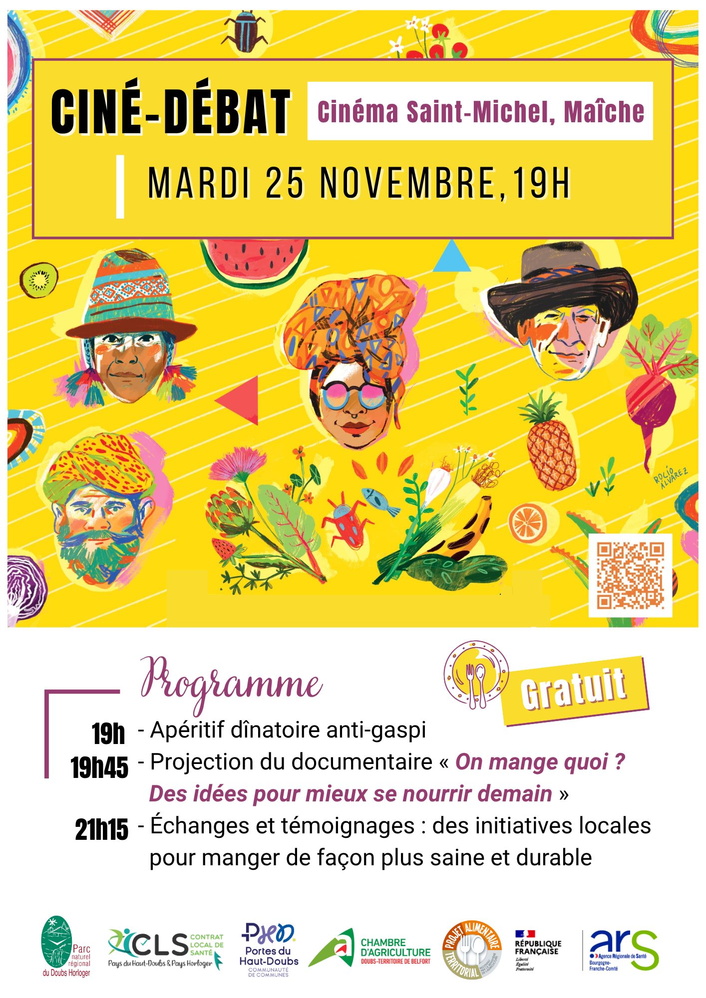 - 19h45 – projection du documentaire “On mange quoi ? Des idées pour mieux se nourrir demain”. Un film éclairant sur l’évolution de notre alimentation et les solutions pour concilier plaisir, santé et respect de l’environnement