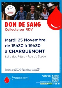 Collecte de 15h30 à 19 h 30, à la salle des fêtes de Charquemont.